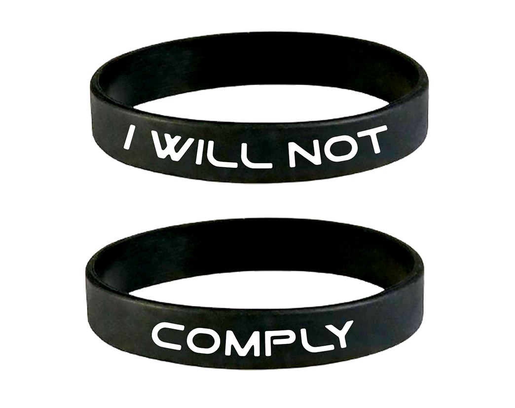 The word “comply” implies following orders, regulations, or laws that may not align with a person’s ethics or moral code. Wearing this wristband is a physical and visual reminder that the wearer is unwilling to abandon their values and beliefs. In expressing non-compliance, a person is empowered to stand up for what they believe in, acting with respect, integrity and a sense of responsibility.