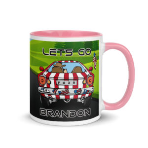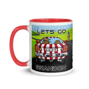 LETS GO BRANDON MUG (white glossy) 11-oz. Let everyone know how you feel…without letting everyone know how you feel. “Huh? No, someone left this here”. Add a splash of color to your morning coffee or tea ritual! These ceramic mugs not only have a beautiful design on them, but also a colorful rim, handle, and inside, so the mug is bound to spice up your mug rack.