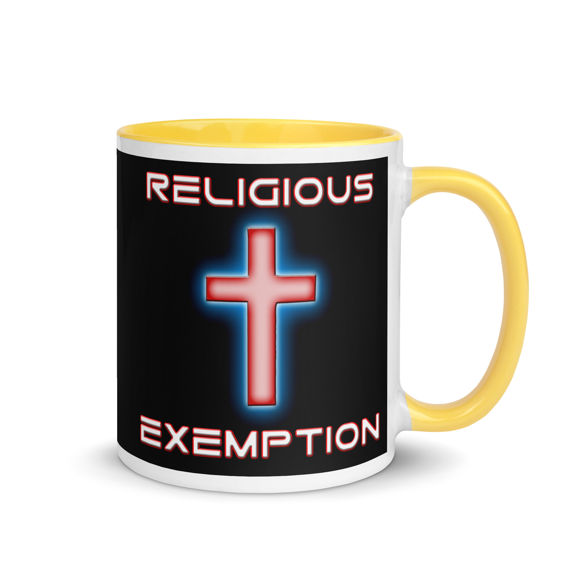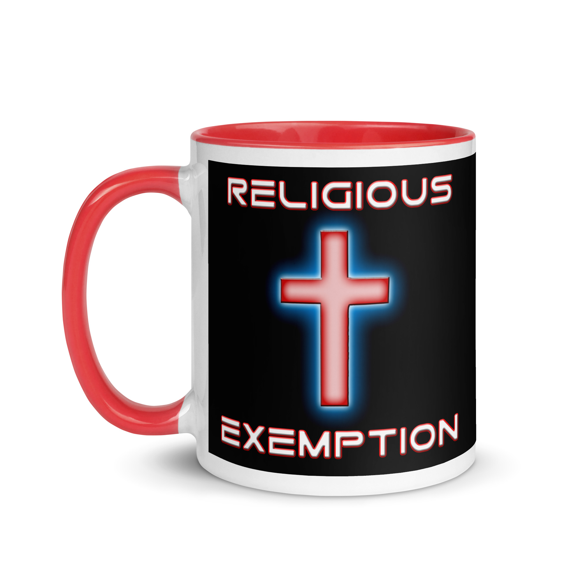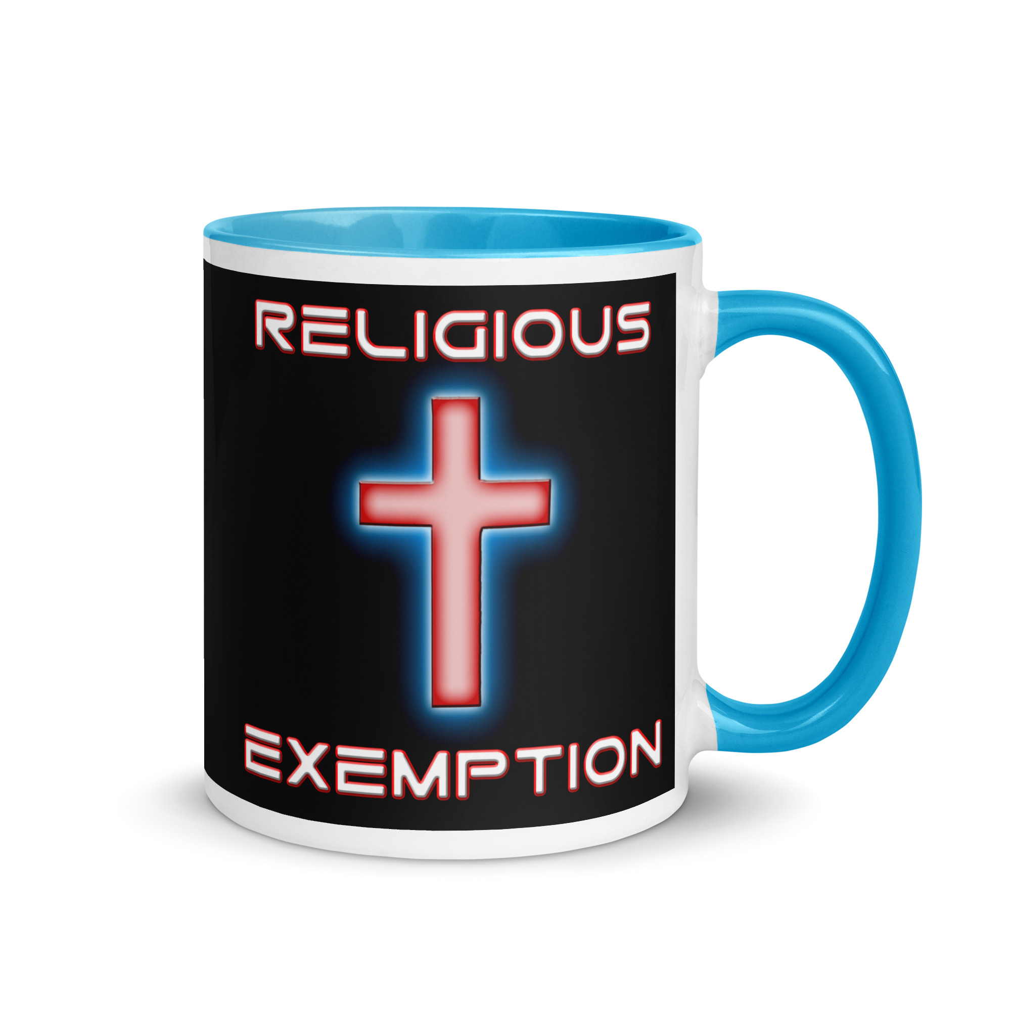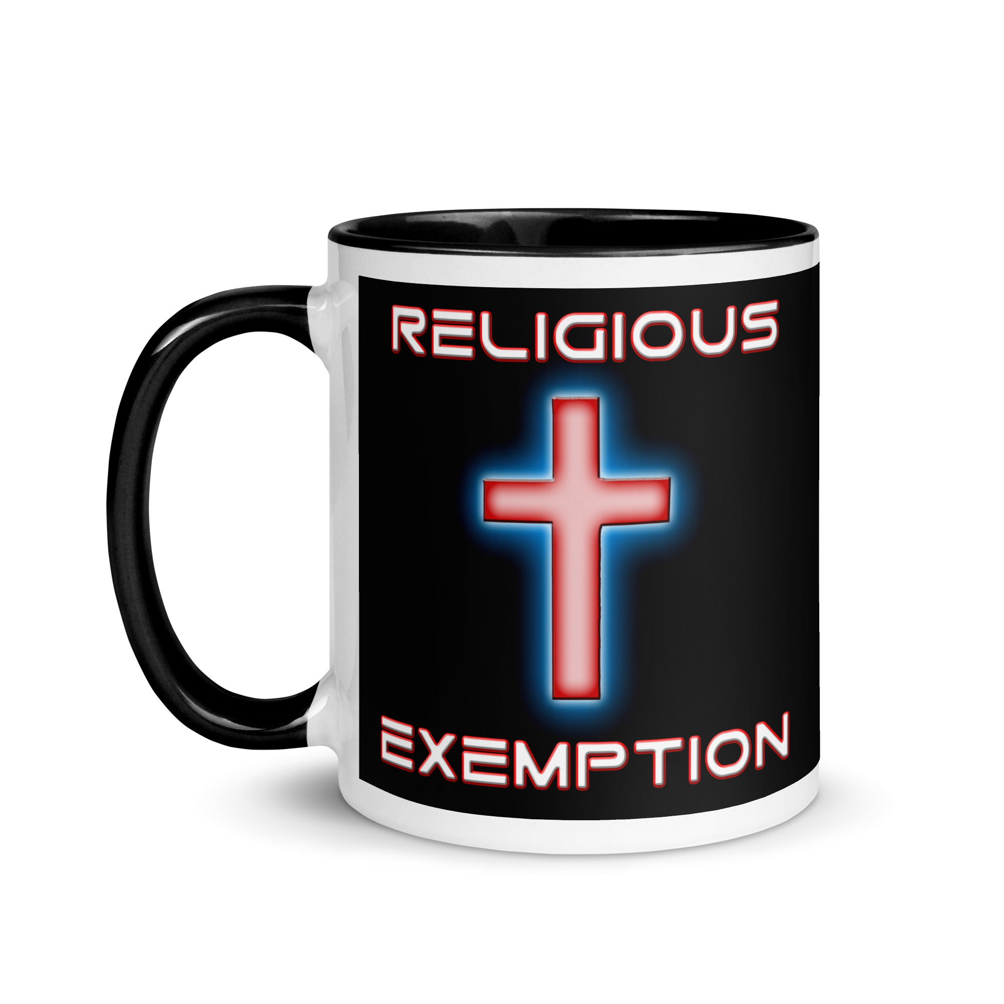 Religious Exemption Mug (pick inside color). Proudly display your status! Add a splash of color to your morning coffee or tea ritual! These ceramic mugs not only have a beautiful design on them, but also a colorful rim, handle, and inside, so the mug is bound to spice up your mug rack.