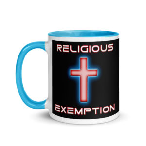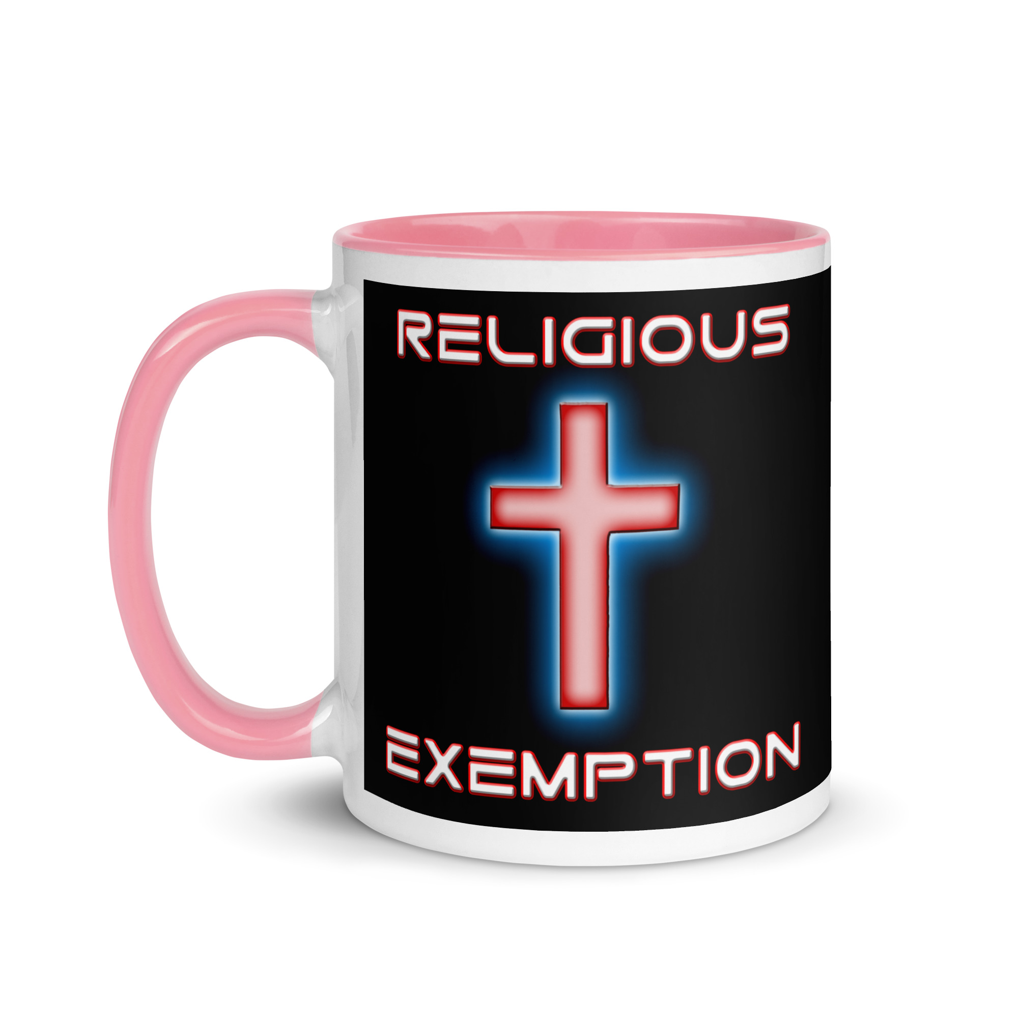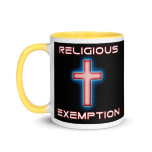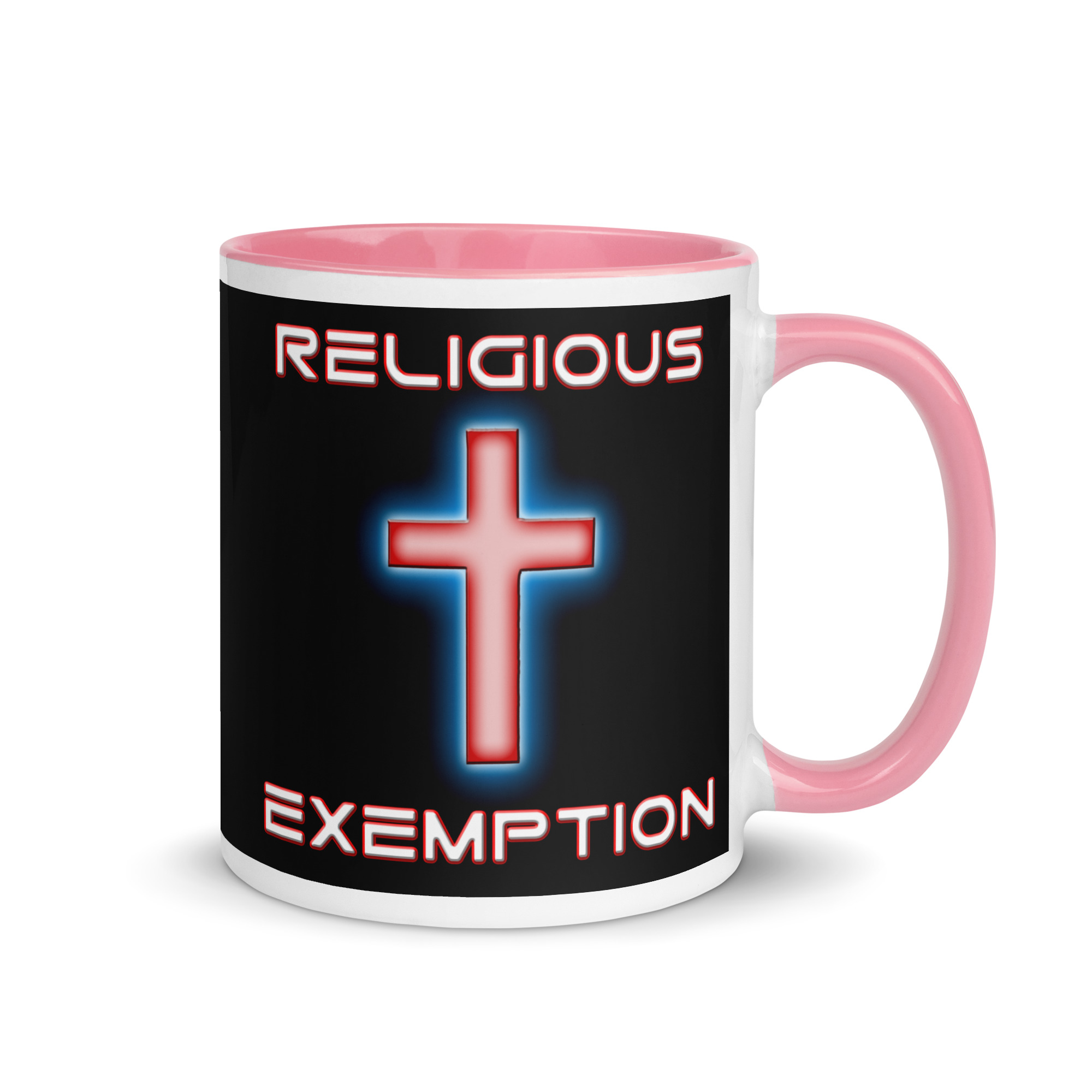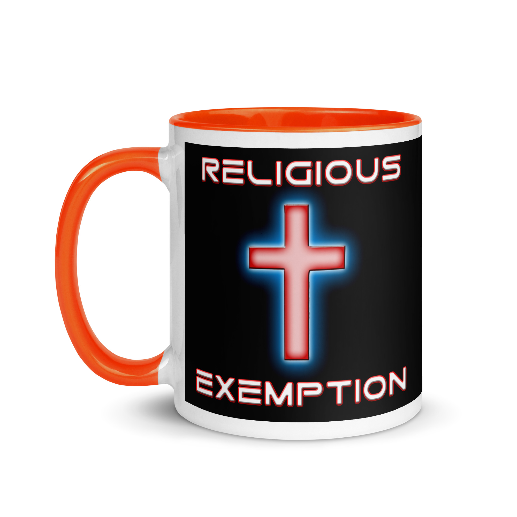 Religious Exemption Mug (pick inside color). Proudly display your status! Add a splash of color to your morning coffee or tea ritual! These ceramic mugs not only have a beautiful design on them, but also a colorful rim, handle, and inside, so the mug is bound to spice up your mug rack.