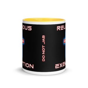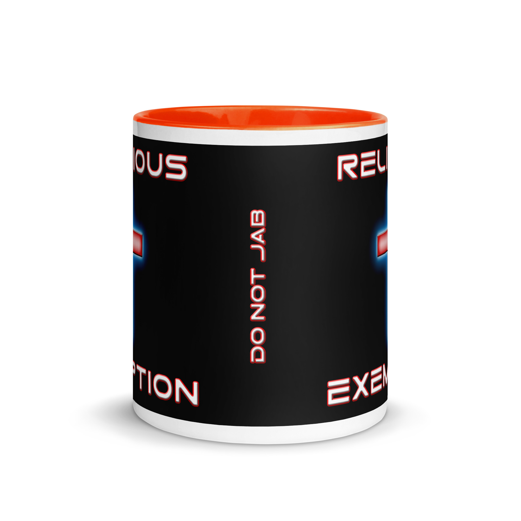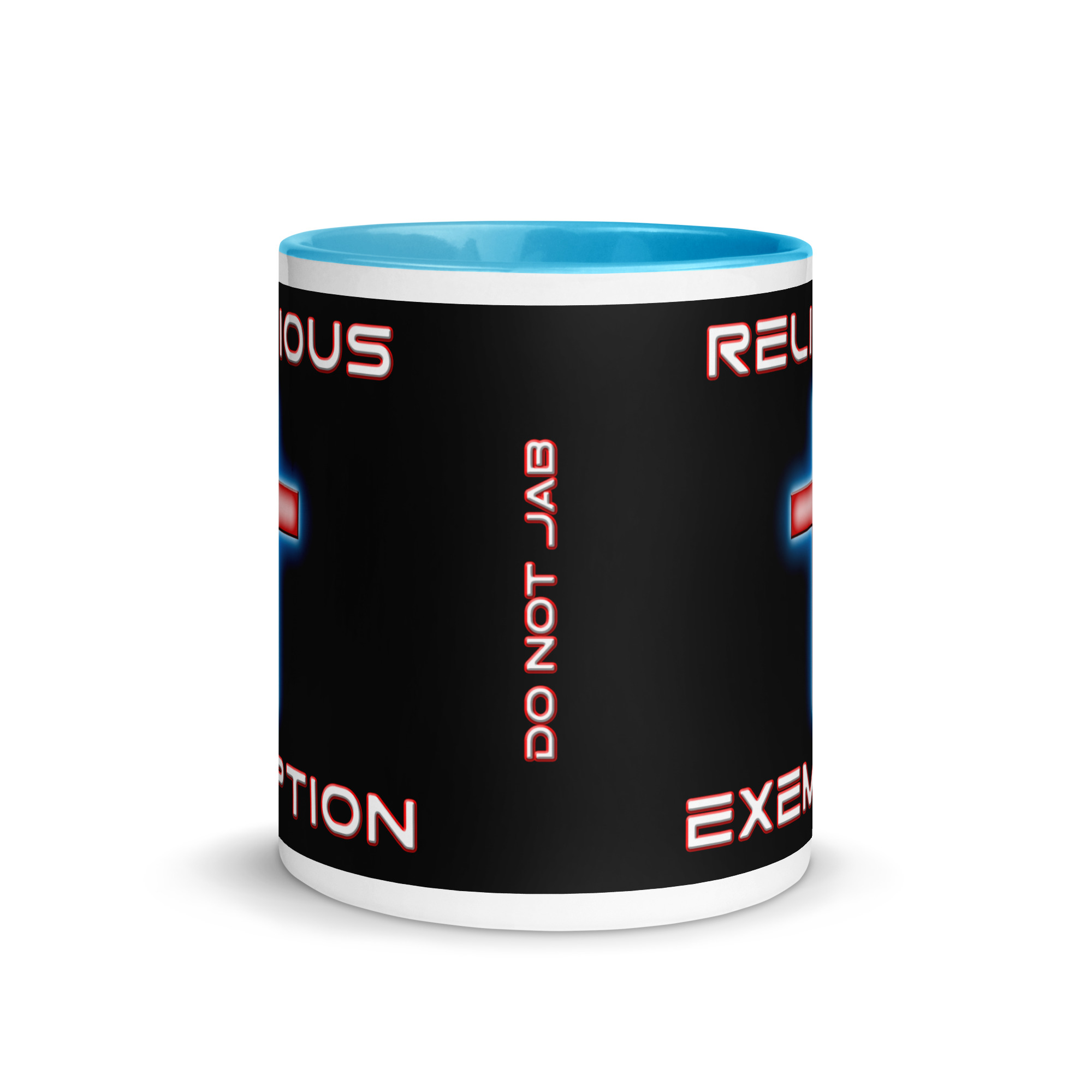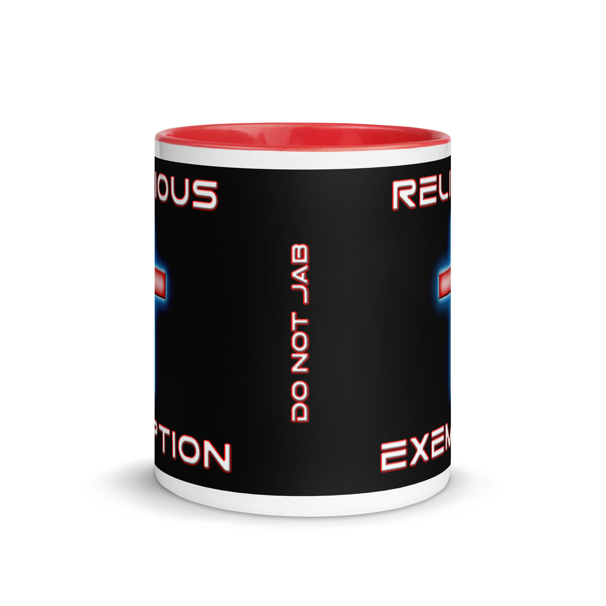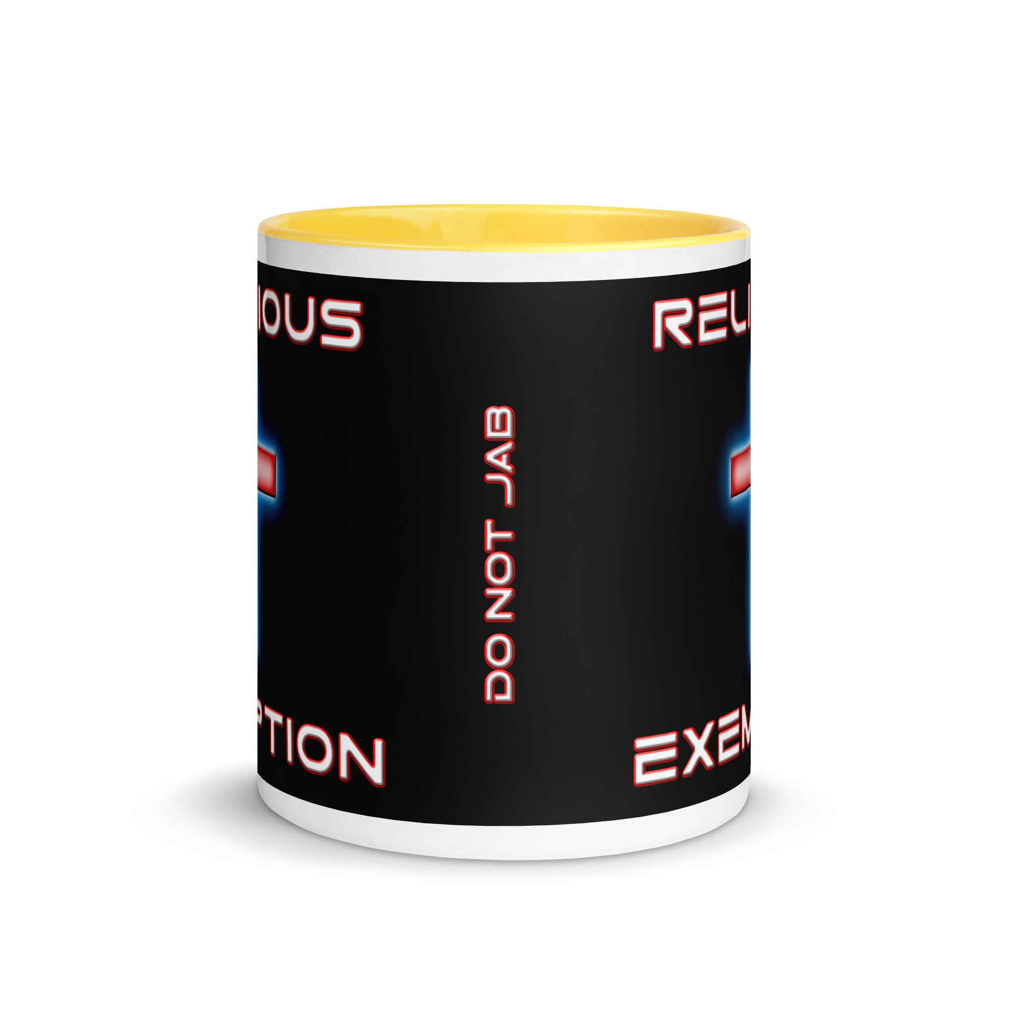 Religious Exemption Mug (pick inside color). Proudly display your status! Add a splash of color to your morning coffee or tea ritual! These ceramic mugs not only have a beautiful design on them, but also a colorful rim, handle, and inside, so the mug is bound to spice up your mug rack.